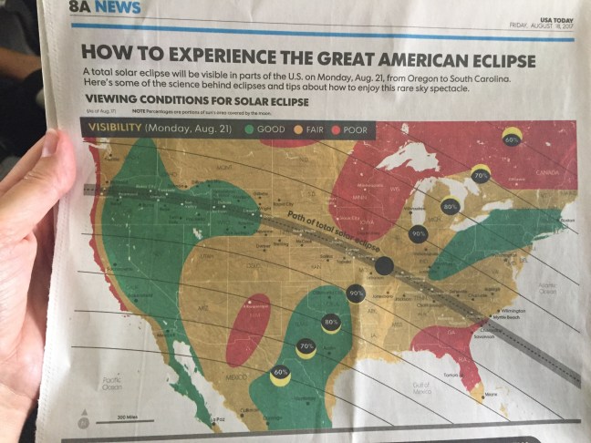 One of my more observant young scientists asked about the clouds spotted to the south. “What direction are they moving towards Mrs. Caldwell? Will they obstruct your view of the corona?” Another… “Will you see Bailey’s Beads? “. They had done their eclipse homework and showed off the cereal box pinhole viewers they planned to use hours later when the sun would be 67% eclipsed on their playground. When I hung up I hoped to be able to call back to my other classes through out the day. Unfortunately AT&T was ill-prepared to support the thousands of us trying to call, text and stream as the day unfolded.