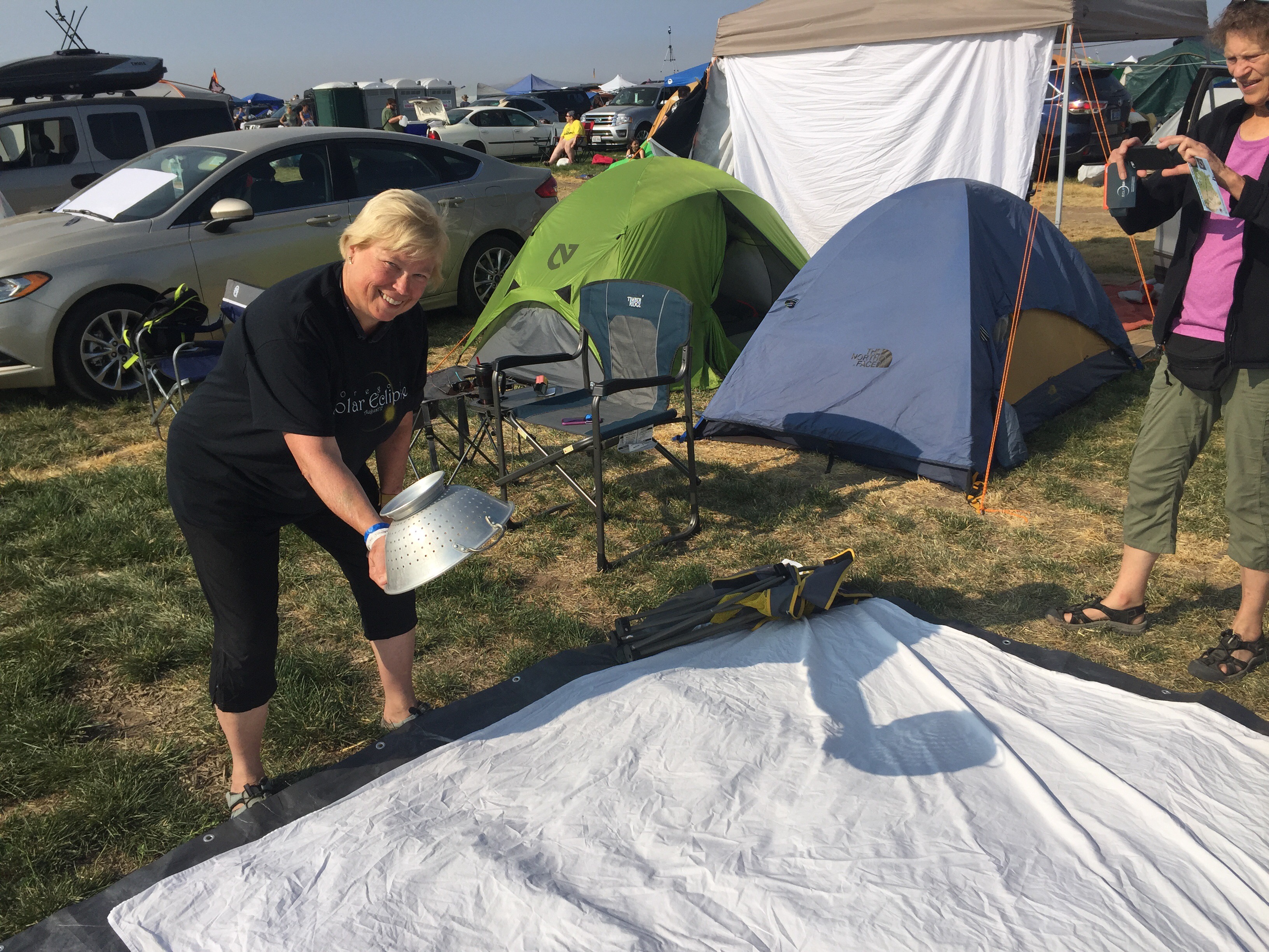 After breakfast everyone scurried around in preparation for the partial and total phases of the eclipse. We stretched out white sheets on the ground and put a sheet of white poster board across the car wind shield all to serve as a screen for pinhole projections of the sun as the moon moved across its face. We readied our cameras and binoculars by taping solar filters over the lenses and made sure our eclipse glasses were handy to grab.