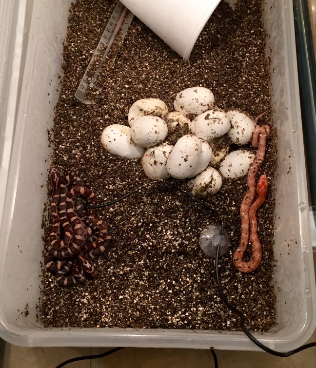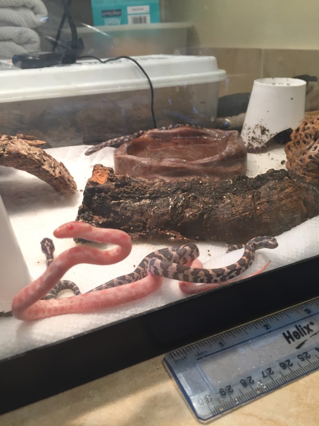 Notice the babies are out of their incubation shoebox and exploring their new “nursery”. I lined a 10 gallon aquarium with moist paper towels, added two shallow water dishes and added lots of places for them to hide. The heat lamp is on one side. I measured several of the babies and it seems that most are about 25cm long! A good healthy size for newborn snakes. The next big event that we are awaiting is for all 13 babies to shed. After their first shed they will be ready for their first meal, a pinkie mouse. I am hoping for Friday or Saturday for their first feeding!